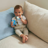 Small and lightweight so perfect for on the go and tiny hands. The textured bumps on the back gently massage a baby’s gums to relieve pain. Protected with BioCote® Antimicrobial Technology, perfect for on the go.