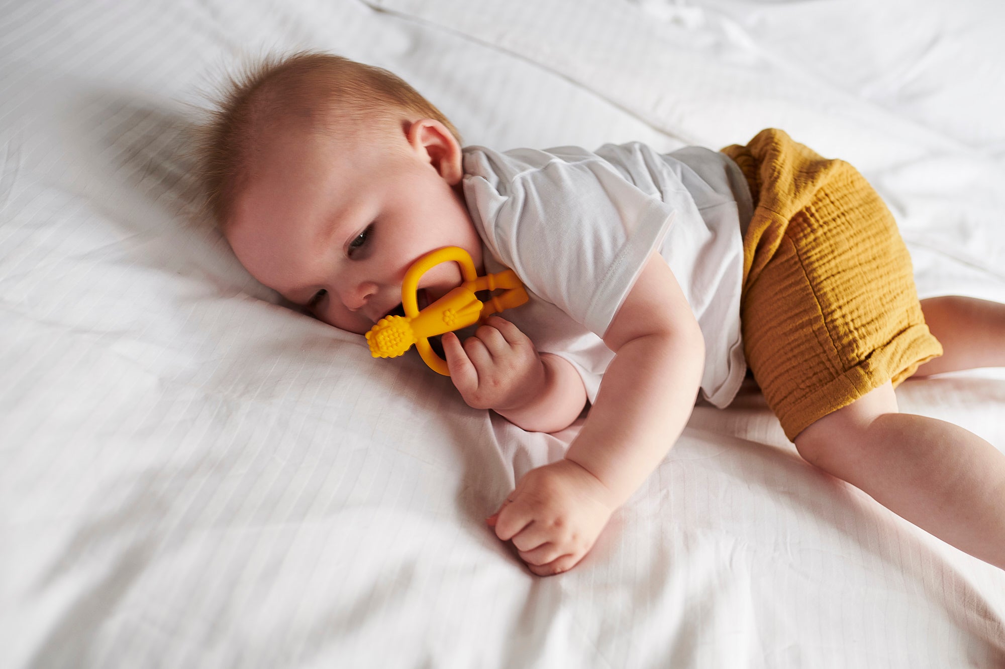 Baby gums are gently massaged by the textured bumps on the back of Matchstick Monkey's head, helping to soothe teething pain.