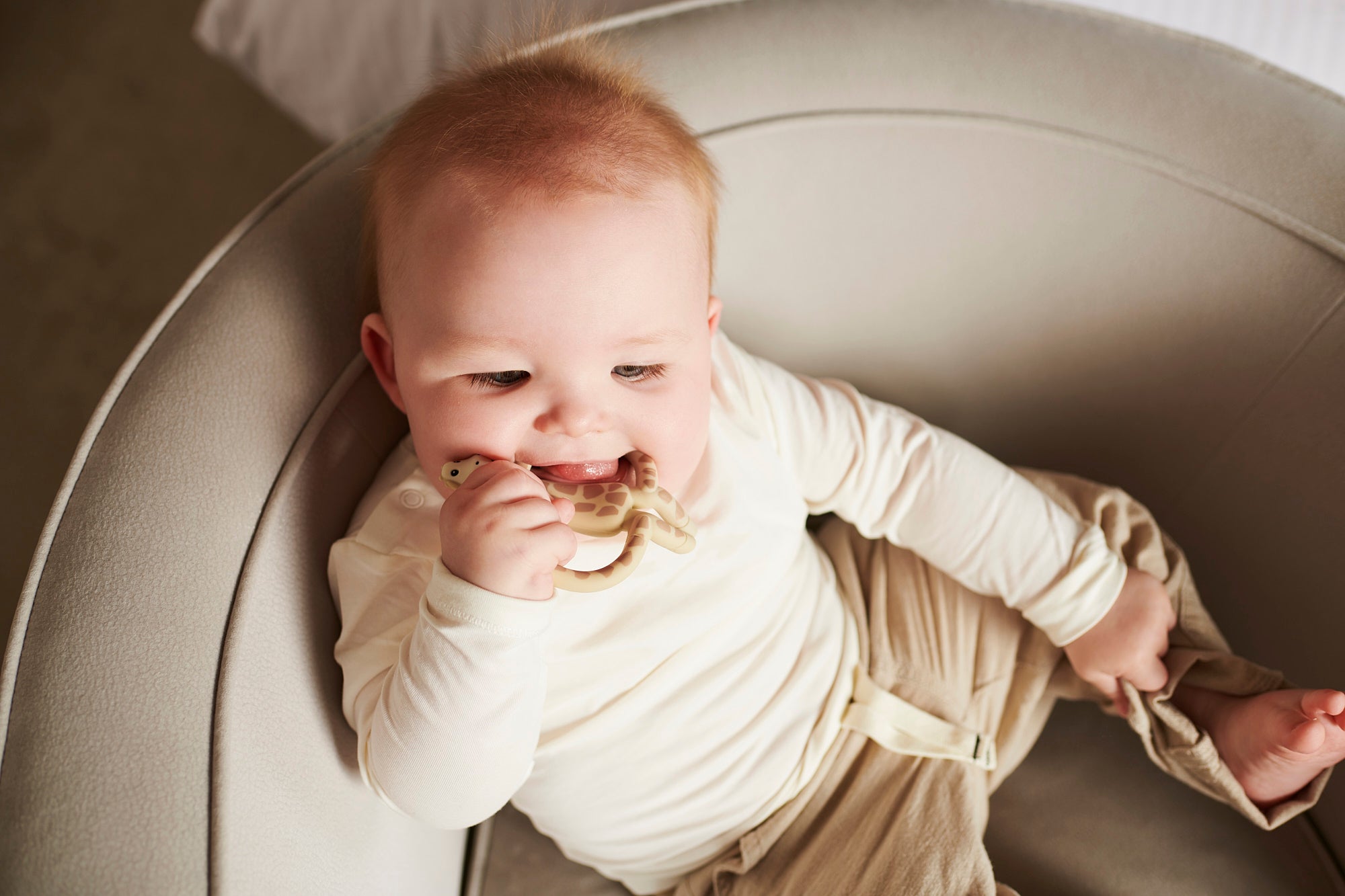 - Gigi Giraffe is a fun, soft textured silicone teether providing soothing relief to aching gums